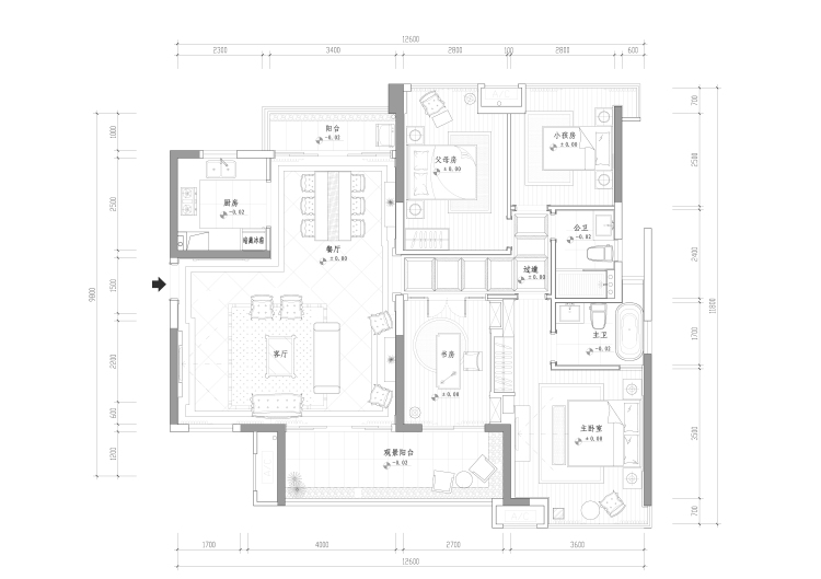 这是橡树湾中一套160㎡的四居室,户型面积中等,采光条件好,但内部分区较多,休憩区分区杂乱,需要设计出有逻辑的行动走线,这样整体空间才具有设计感和时尚感,将餐厅与客厅中的非承重墙拆除 MK体育最新版本,将两个功能区合二为一,扩大了公共区域面积,使日常走动更为方便,以过道为中心,南北各分布两个休憩区,日常生活变得更为舒适。