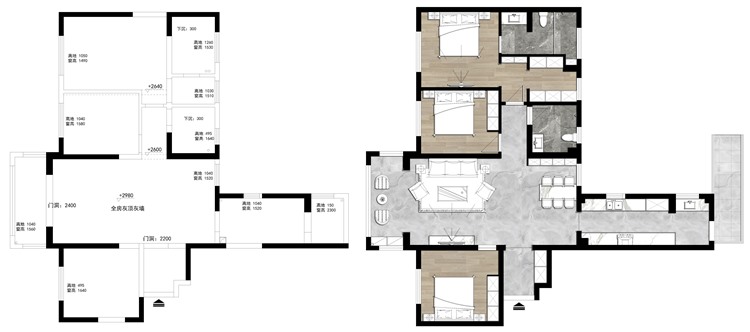 这套位于泛海国际的四居室住宅建筑面积约为175㎡,户型结构虽然不算很规整,但是好在也没有各种难以设计处理的犄角空间,为了将空间更加合理的利用,设计师将房屋中相对比较突兀的区域改造成厨房,这样能够借助户型的结构将厨房油烟更好的释放出室外,同时,为了提升主人的家居质量,内部两个小空间则直接融入主卧中改造成主卧附带的卫浴空间与迷你衣帽间 MK体育官网入口