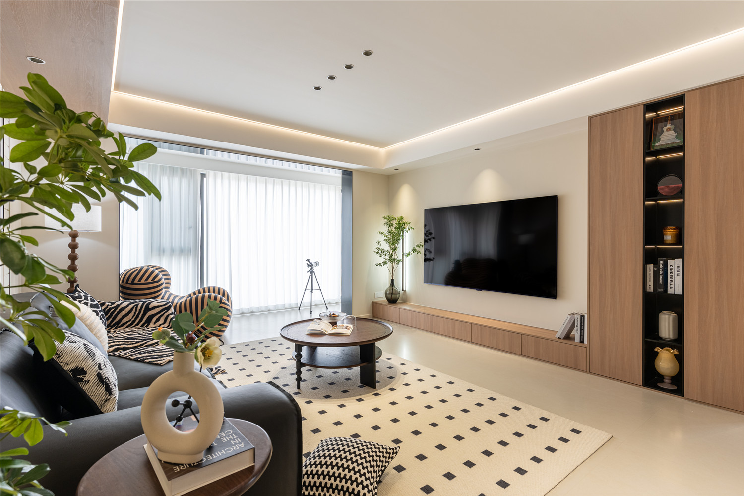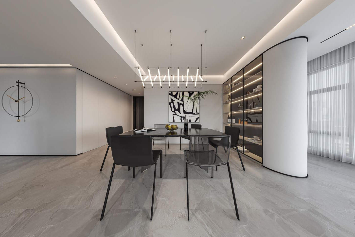 以线条装饰打造的墙面简约而又不失沉稳高级感,圆形巨型吊顶则营造品质格调感。