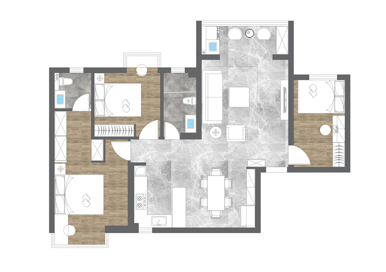 江山如画这套120㎡的三居室住宅原始户型结构已经进行了基础的功能分区,不过业主认为原有的功能分区并不能满足自己与家人日常起居使用需求,因此设计师在原有户型结构基础上进行了一定的调整,将入户拐角区域的小空间改造成次卧 MK体育安卓版,满足客人起居使用需求,厨房与就餐区域则设计在卧室与客厅的衔接空白处,同时通过软隔断进行空间分隔,以提升空间的利用率。