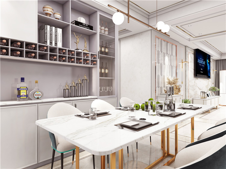 就餐区域沿用与客厅一致的白色及镶边处理,强调空间和谐感 MK体育最新版本,墙面区域的简单艺术摆件现代时尚气息浓厚,为空间增添摩登色彩。