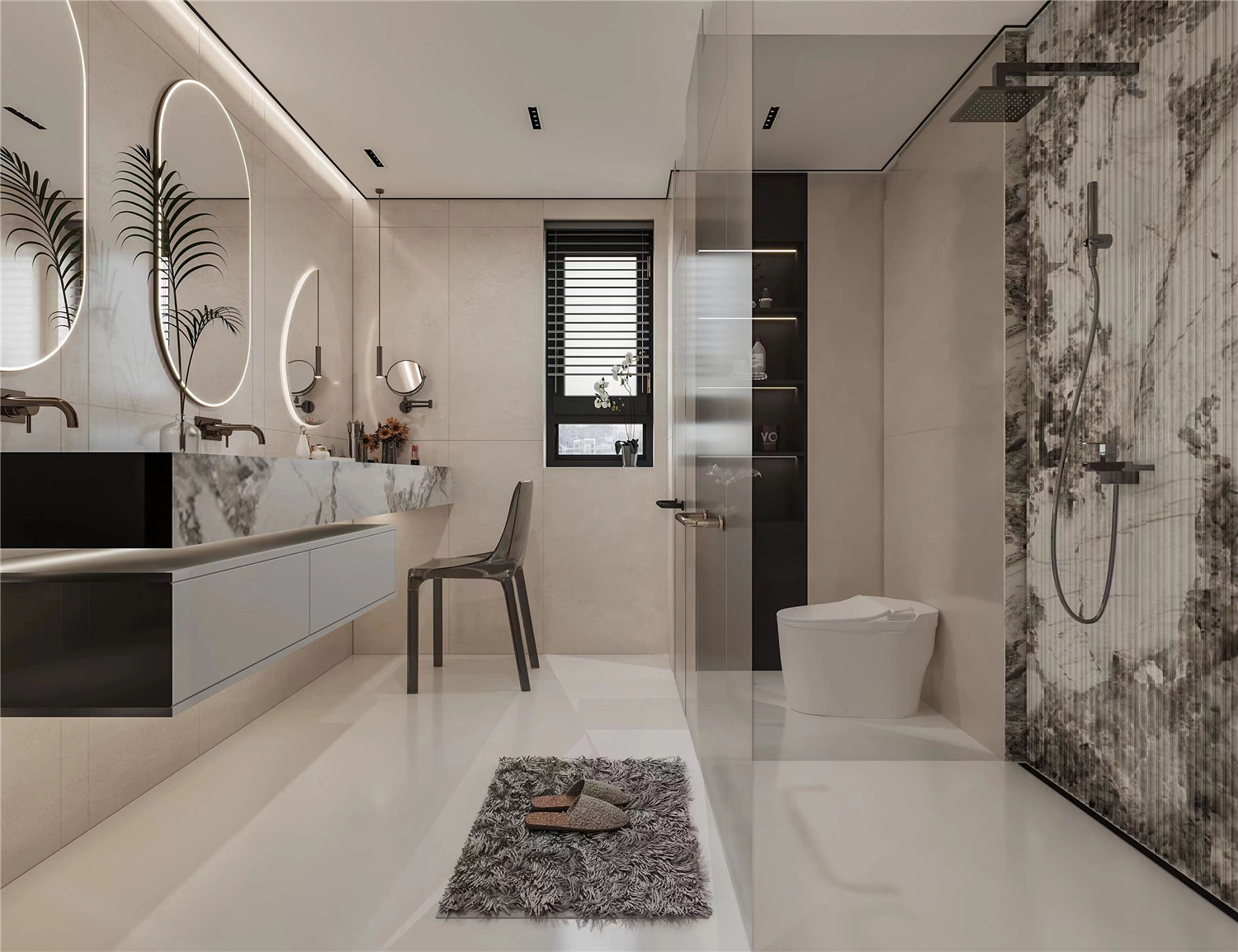 大面积的灰色暗纹瓷砖低调又耐看,搭配以裸方形瓷砖,强调区域实用性。