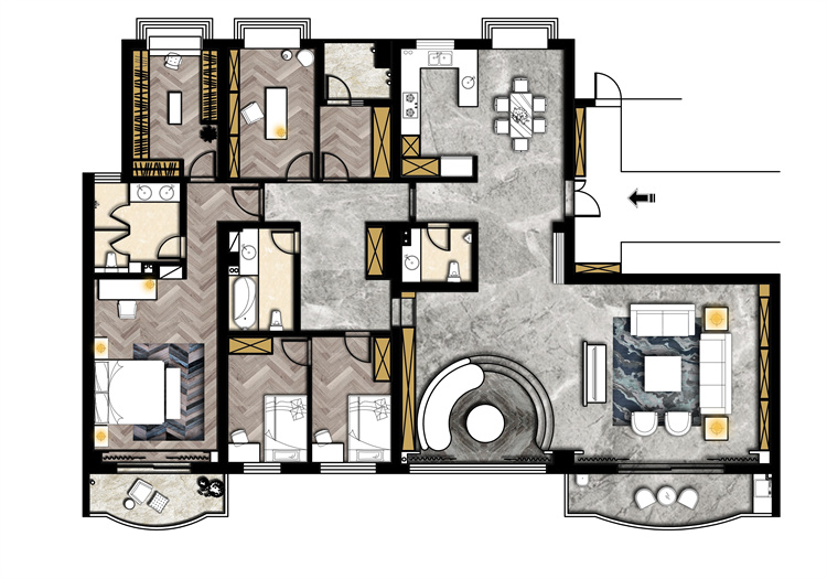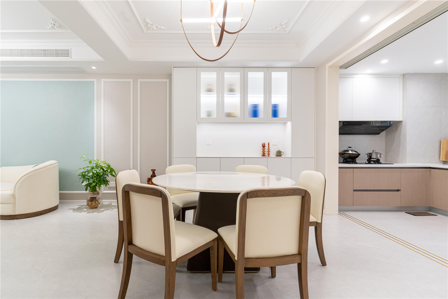 怡景花园这套四居室的住宅面积约为175㎡,原有的户型结构只是进行了简单的功能分区,并不能满足业主一家四口的起居使用需求,因此设计师将其中一个大的空间隔成两个小卧室,满足两个孩子的日常起居使用,而为了提升生活品质,设计师利用入户走廊做软隔断,将其中一部分区域打造为厨房与就餐区域 MK体育手机版,另外一部分则设计为客厅,以提升空间的合理性。