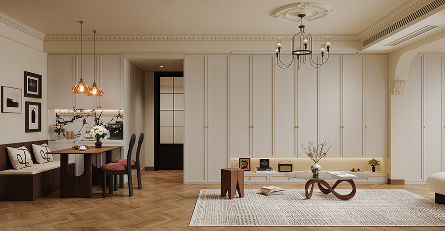 2    餐厅餐桌靠墙摆放,家居动线合理开阔,餐边酒柜美观实用。