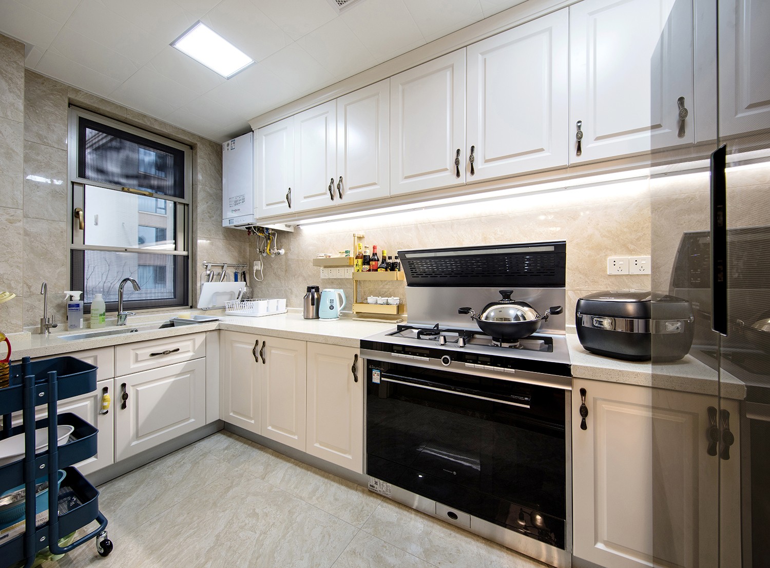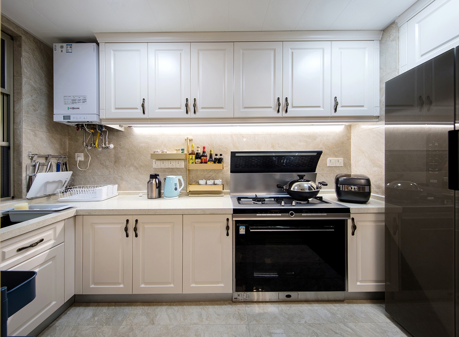 大面积的浅色瓷砖确保了厨房油烟能够得到更好的清理,而悬挂式橱柜的存在则有效提升了空间利用率 MK体育ios版。