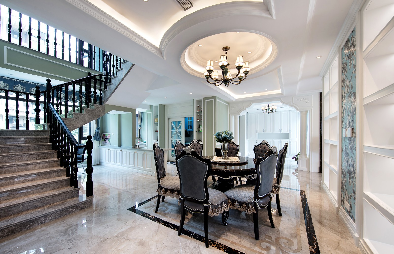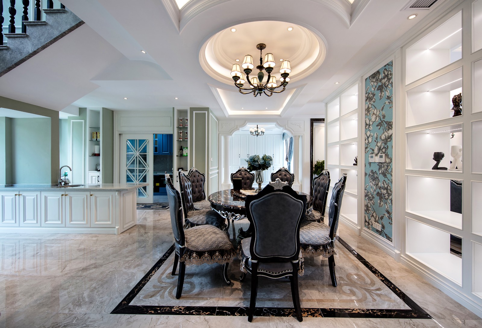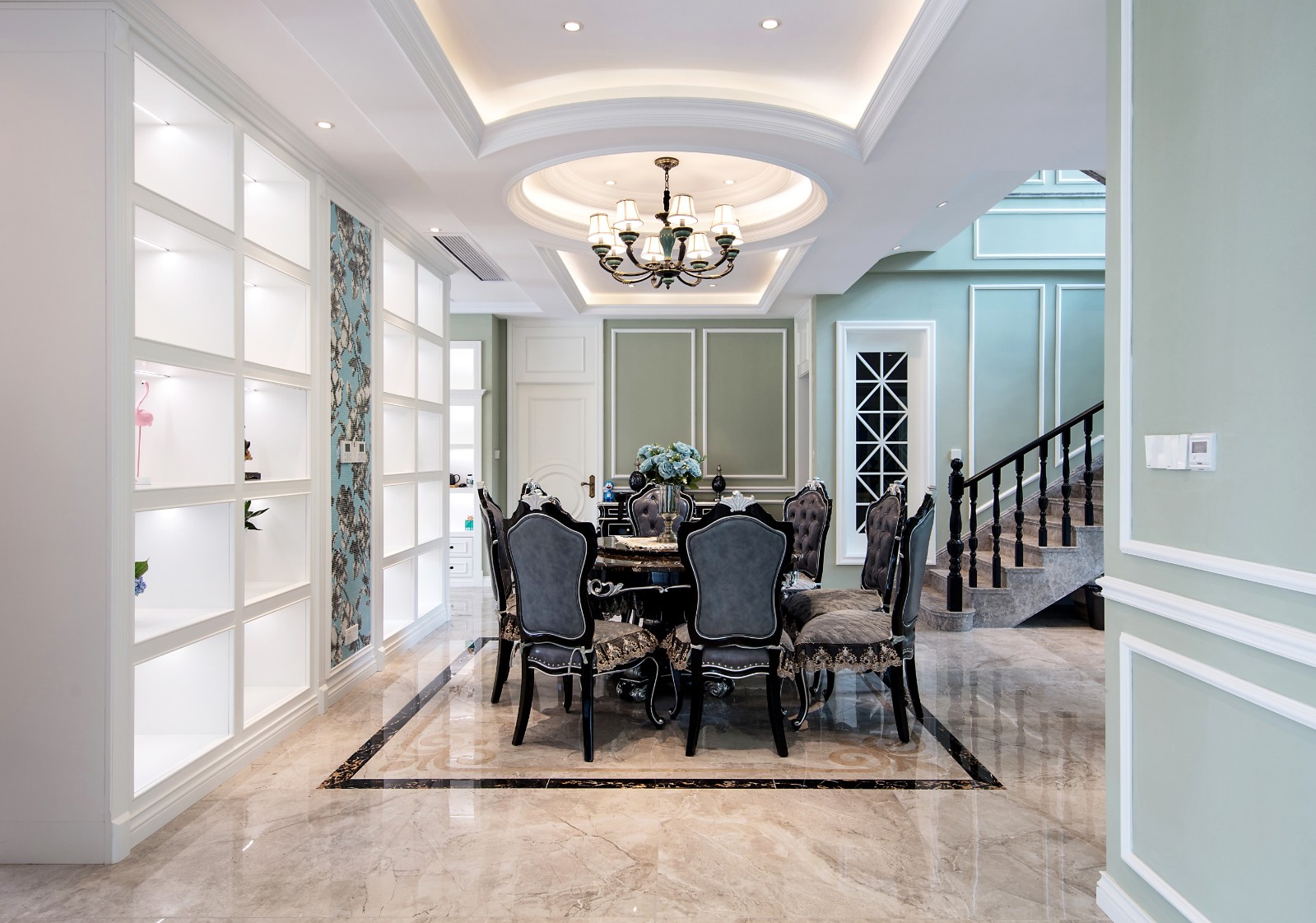 大理石暗纹地板清冷而又不失高雅气息,搭配以圆形艺术感吊灯设计,复古造型吊灯,为就餐区域奠定了典雅格调气息 MK体育手机版。