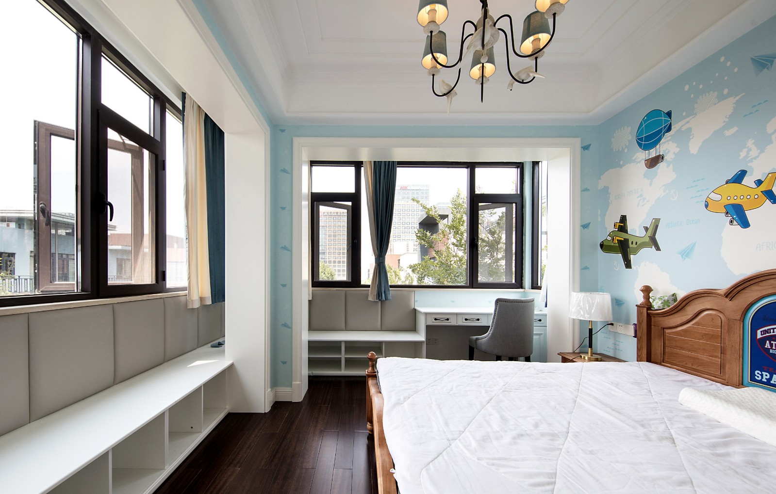 卡通造型的墙面设计让儿童房的童真趣味感十足,两面墙都设置了大面积的窗户,确保室内空气的流通 MK体育ios版。