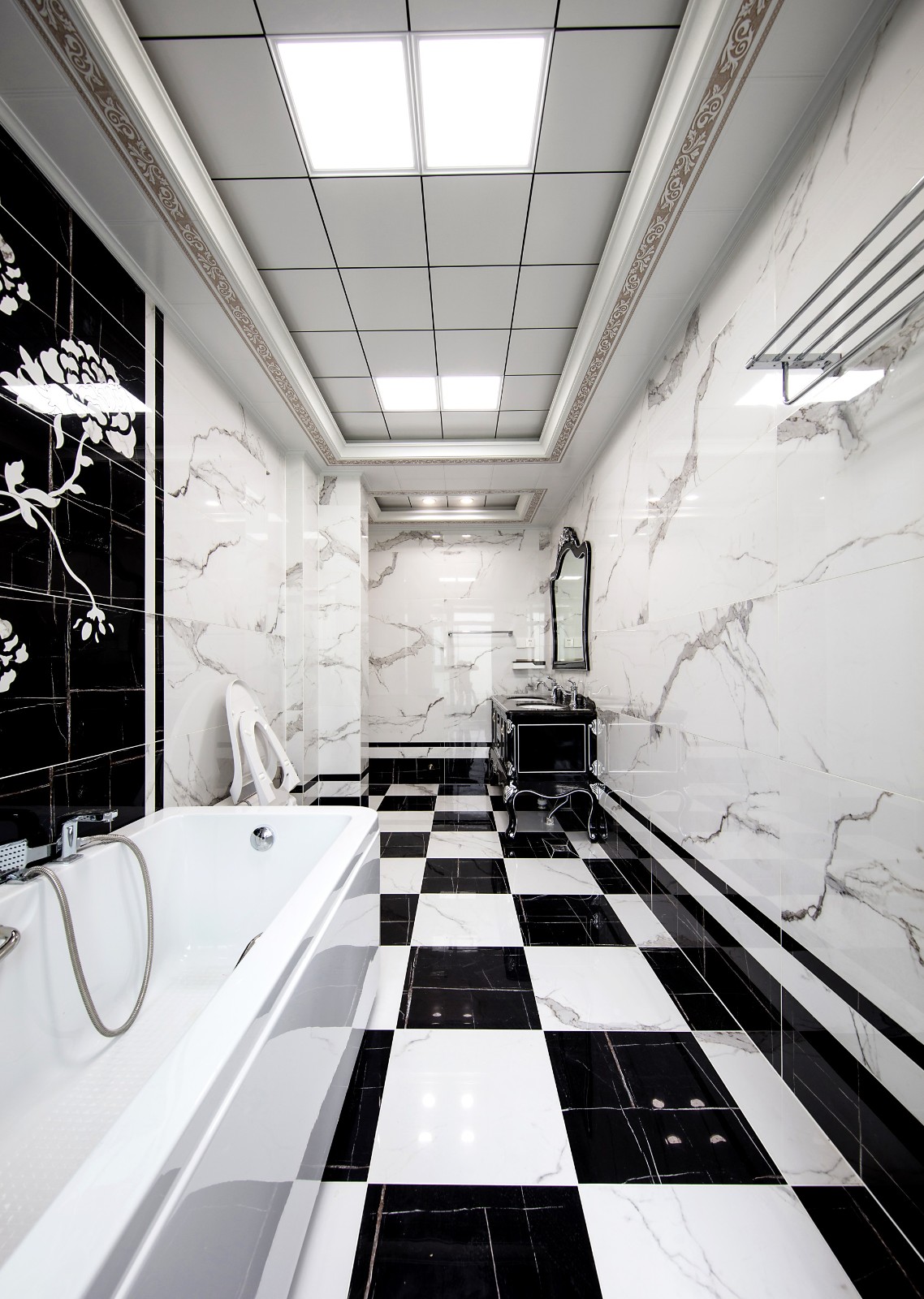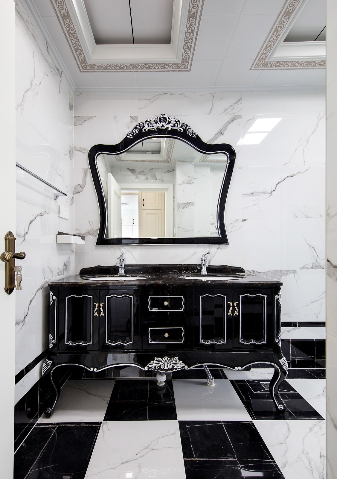卫生间区域借助黑白色瓷砖的碰撞营造一种超现代的时尚感,而造型独特的置物柜与镜子 MK体育平台登录,则让卫生间区域多了一抹精致的贵族气息。