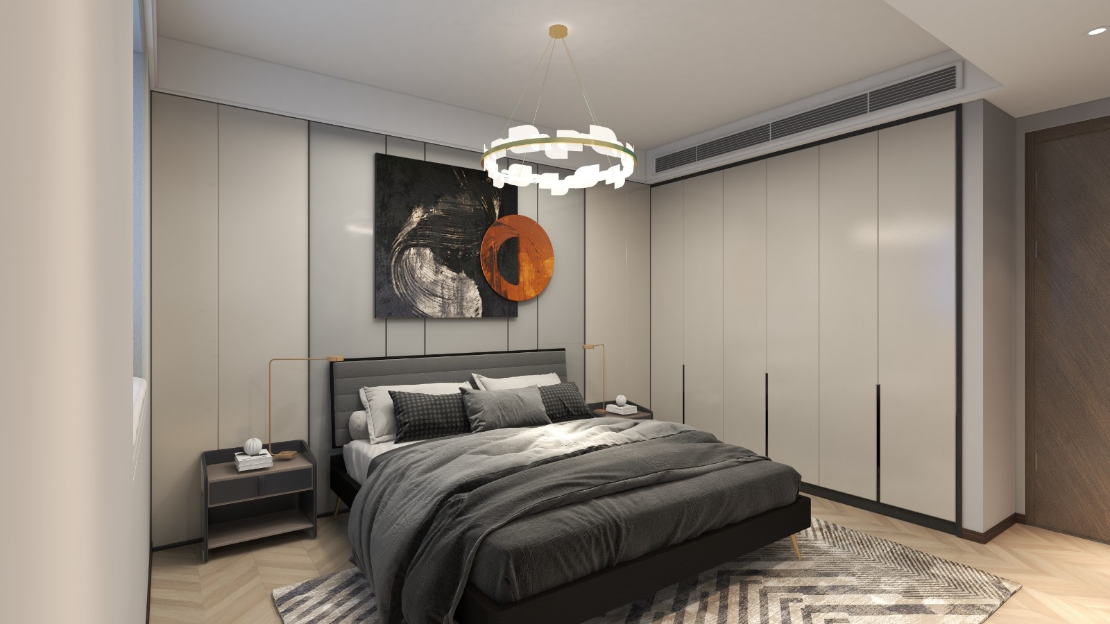卧室背景墙借用线条抒发空间简约洁净氛围,舒适柔软的床具搭配上简洁大方的设计,让人在素雅洁净中更好享受生活的宁静 MK体育安卓版。