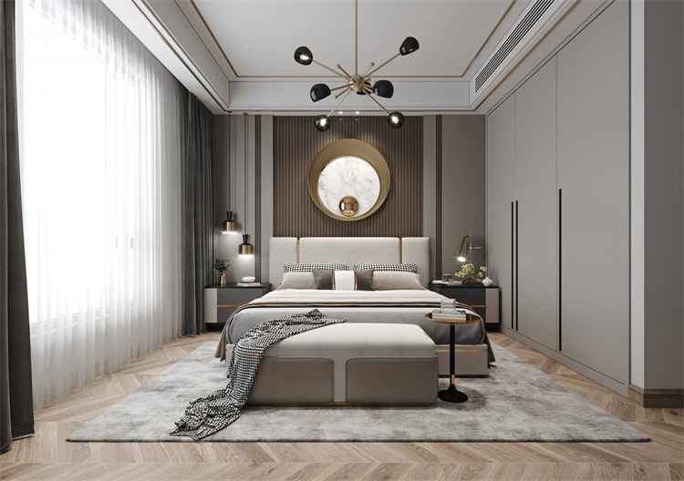 对称式床头设计给人以沉稳典雅气息 MK体育ios版,放射式灯饰既吊顶处的金色镶边处理则平添高级格调。