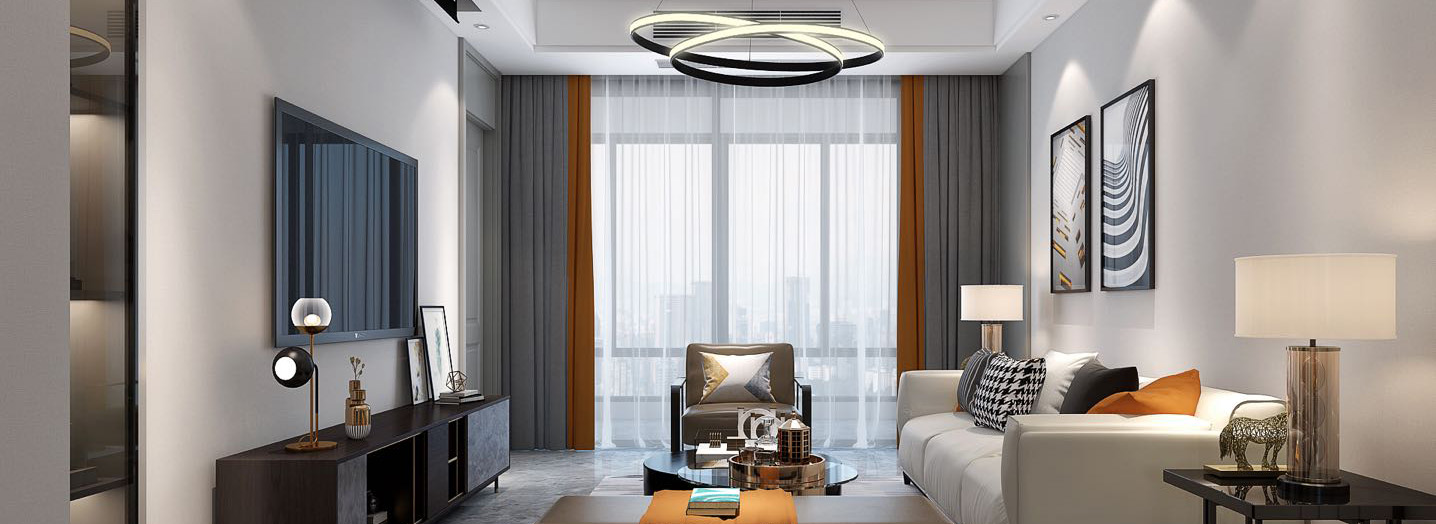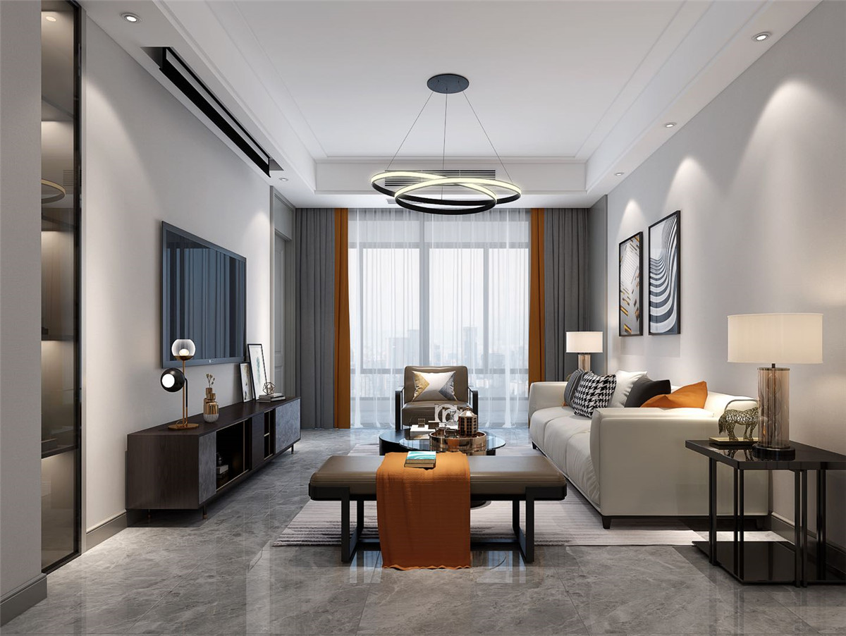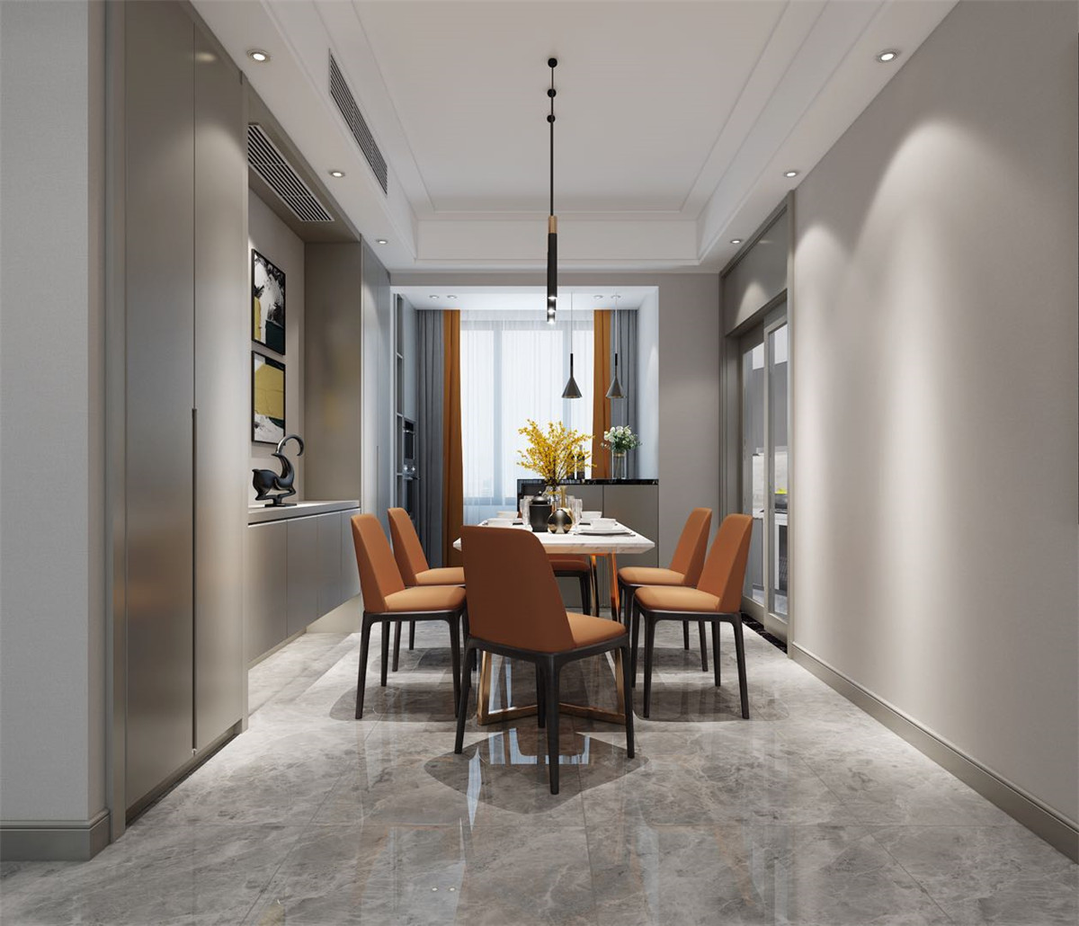 • 整体色调为灰白色,去除复杂的造型,力求简洁明朗的感觉,软装配饰点缀暖橙色提高空间层次感