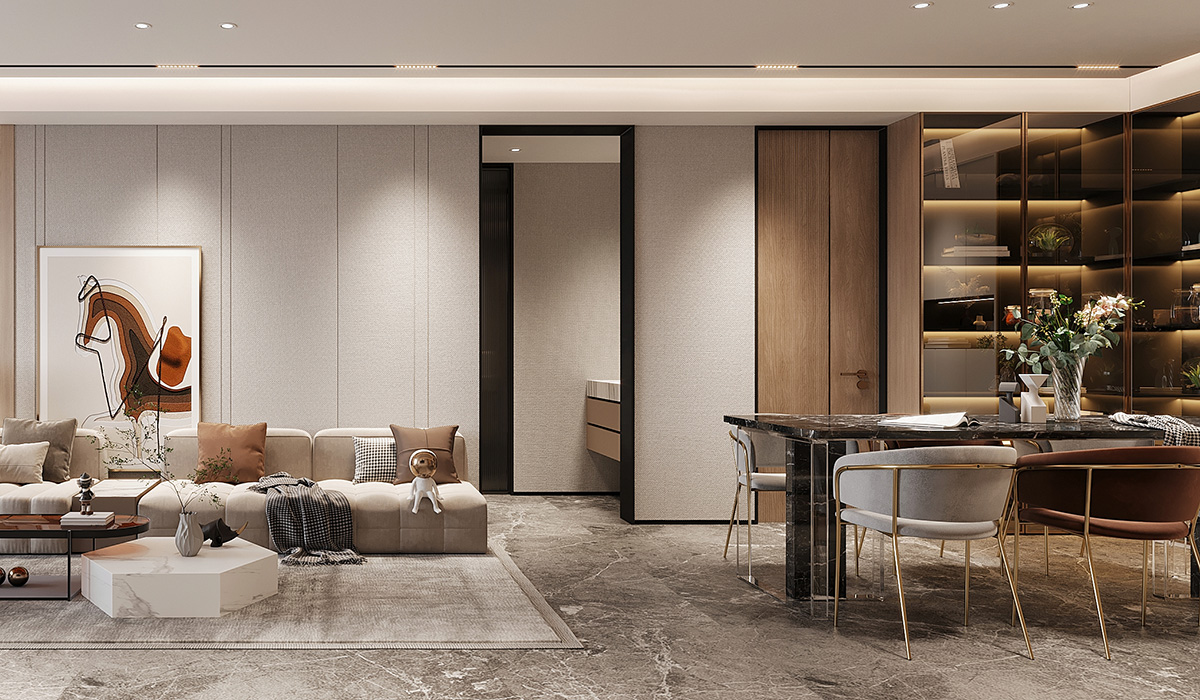 由天地壁三个面向来陈述运用垂直水平几何线条电视墙,机能整合与建筑概念的导入掌握空间的特质与需求