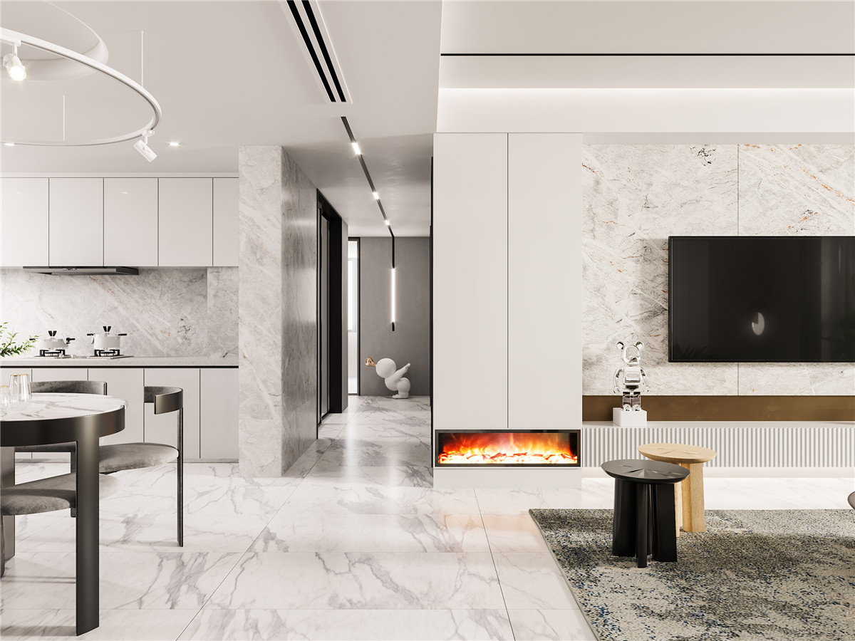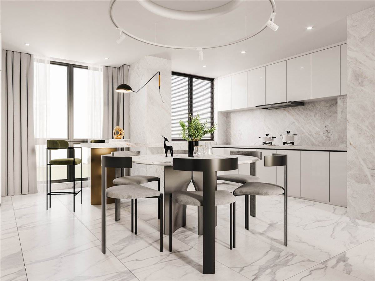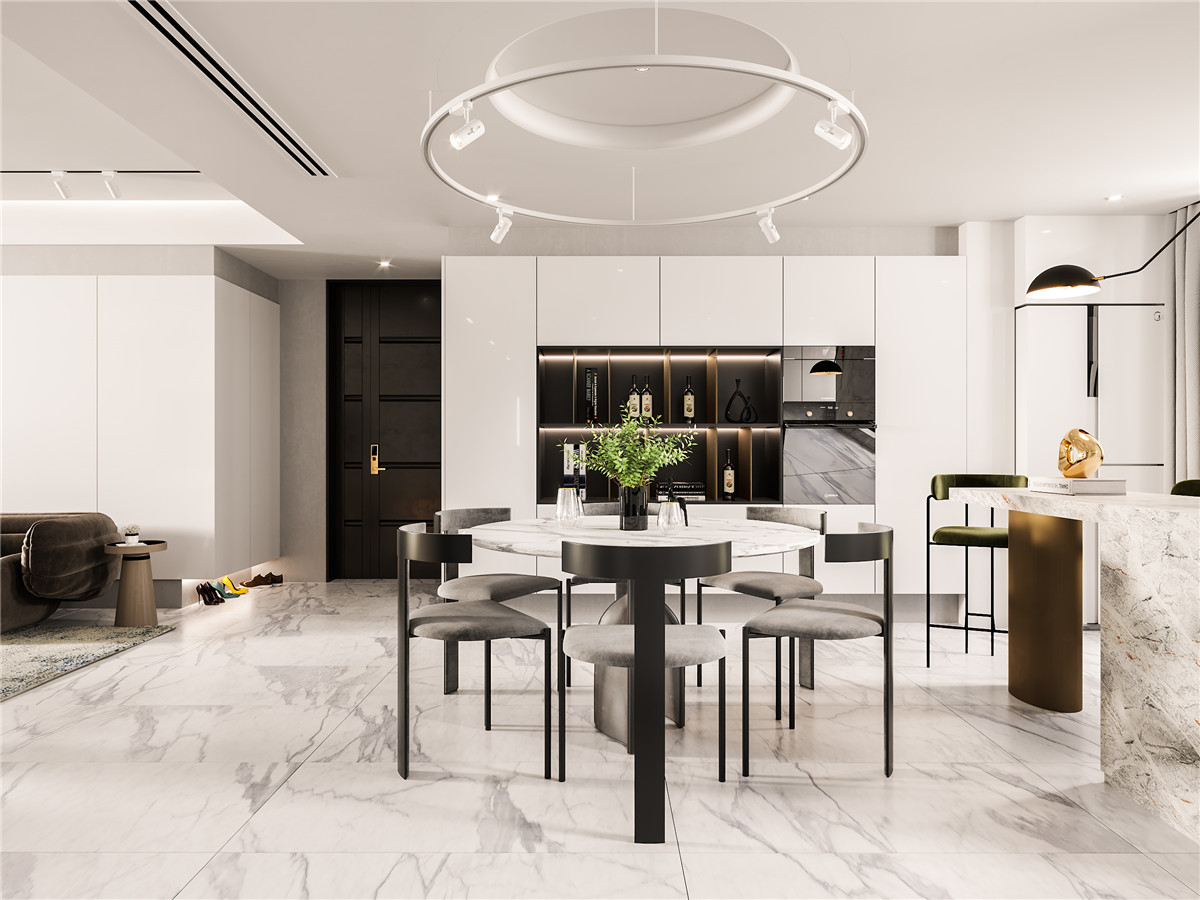 本案是一对90后小夫妻的婚房,女主人喜欢烹饪希望厨房大,男主人希望有个独立书房。根据业主的生活习惯本方案的定位是现代简约风。白色柜子搭配大理石上墙和爵士白花纹的全抛釉地砖让整个空间变得干净大气。开放式厨房搭配吧台也为女主人的烹饪爱好提供了平台。合理的划分了主卧和儿童房的区域在保证了儿童房的功能上为主卧增加了一个衣帽间保证了储物空间。