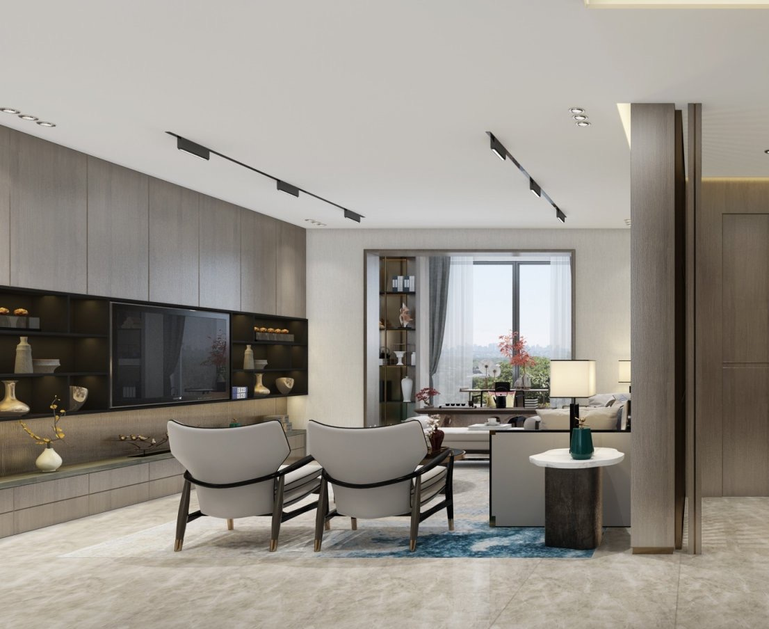 本案采用新中式轻奢设计手法来呈现,对原始户型进行了局部的调整以来更加优化功能分区。整体色彩采用中性咖灰色系。材质采用复合石材及不免硬包、木饰面、天然石材、不锈钢、乳胶漆等为主要材料。厨房利用隐藏式移门来满足日常生活的各种场景。再设计和灯光以及质感为中心理念,围绕宜居,舒适的生活环境为主导思想,从而呈现出业主满意并且具备观赏性及品位的居住空间