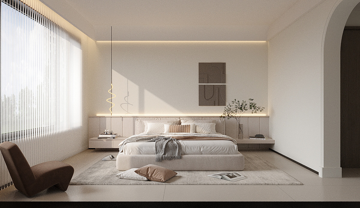 屋主与设计师沟通风格意向之后,一致觉得工作生活已经很忙碌了,世界这么坚硬,应当需要一个柔软的房子。不需要很多棱角,硬装上不用太多花哨的造型,尽可能地让空间平静安宁。