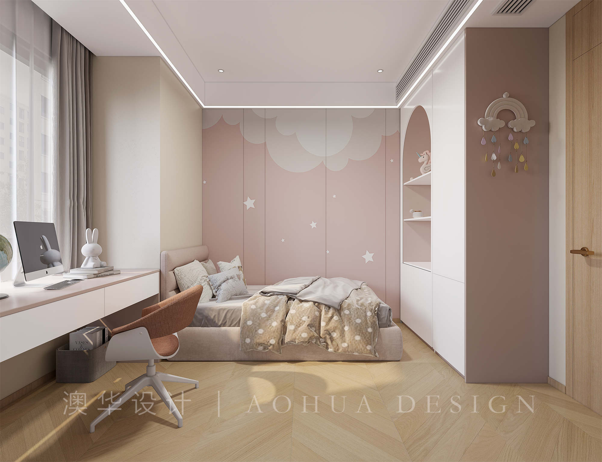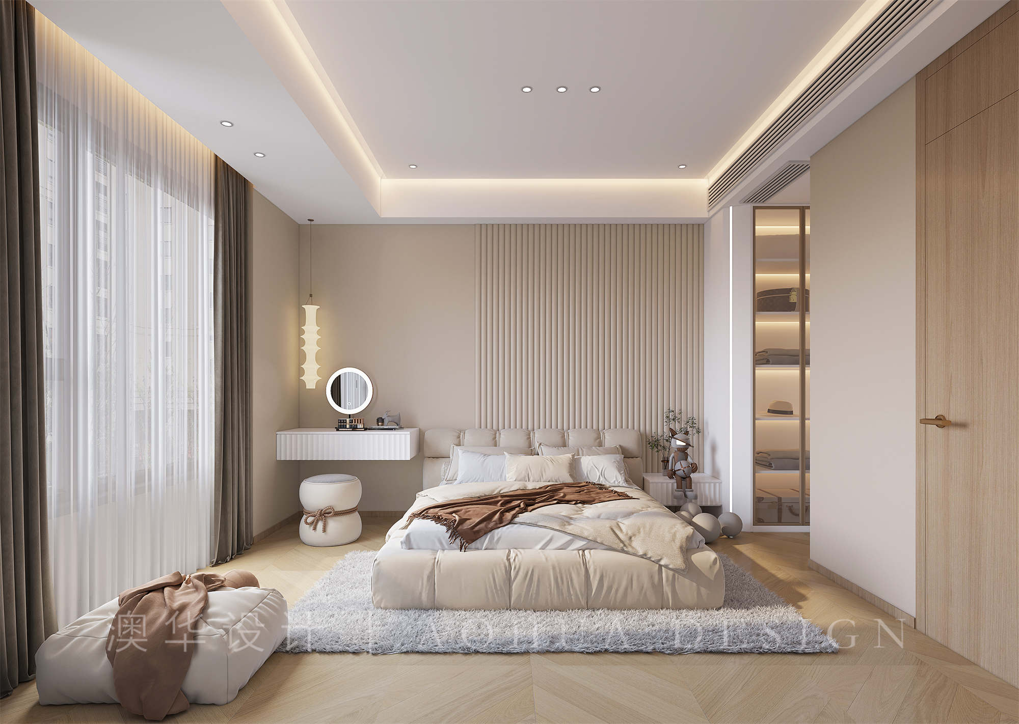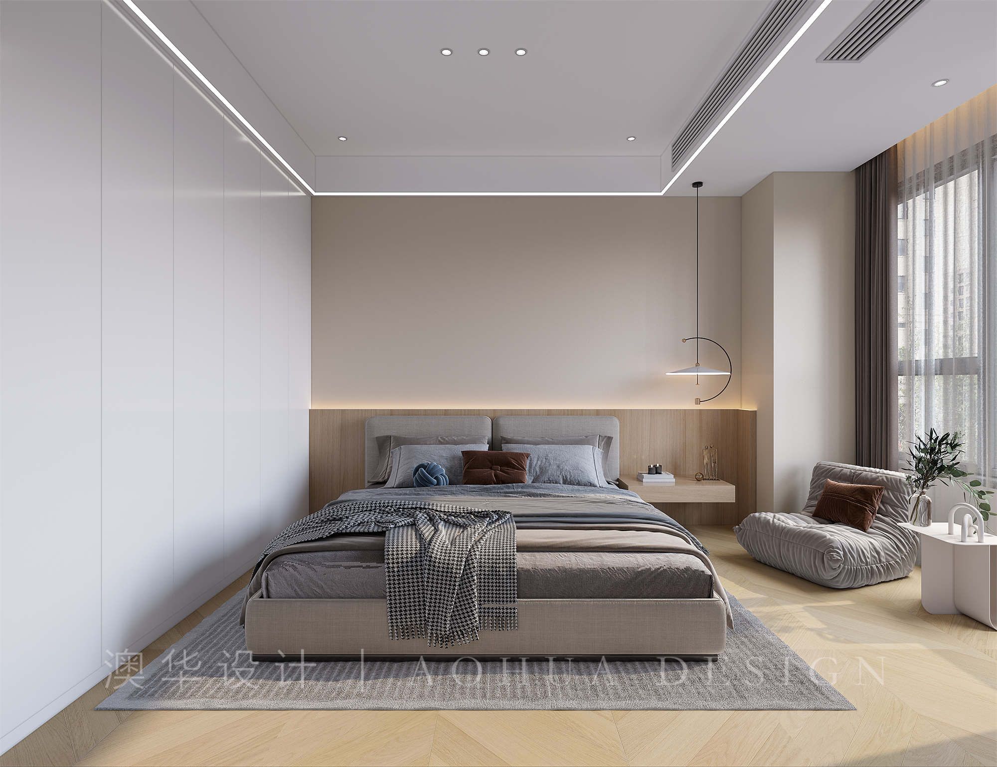 • 卧室采用统一的奶油感涂料,顶部也尽量简洁。窗帘与床色调一致,奶灰质感更显温馨柔和