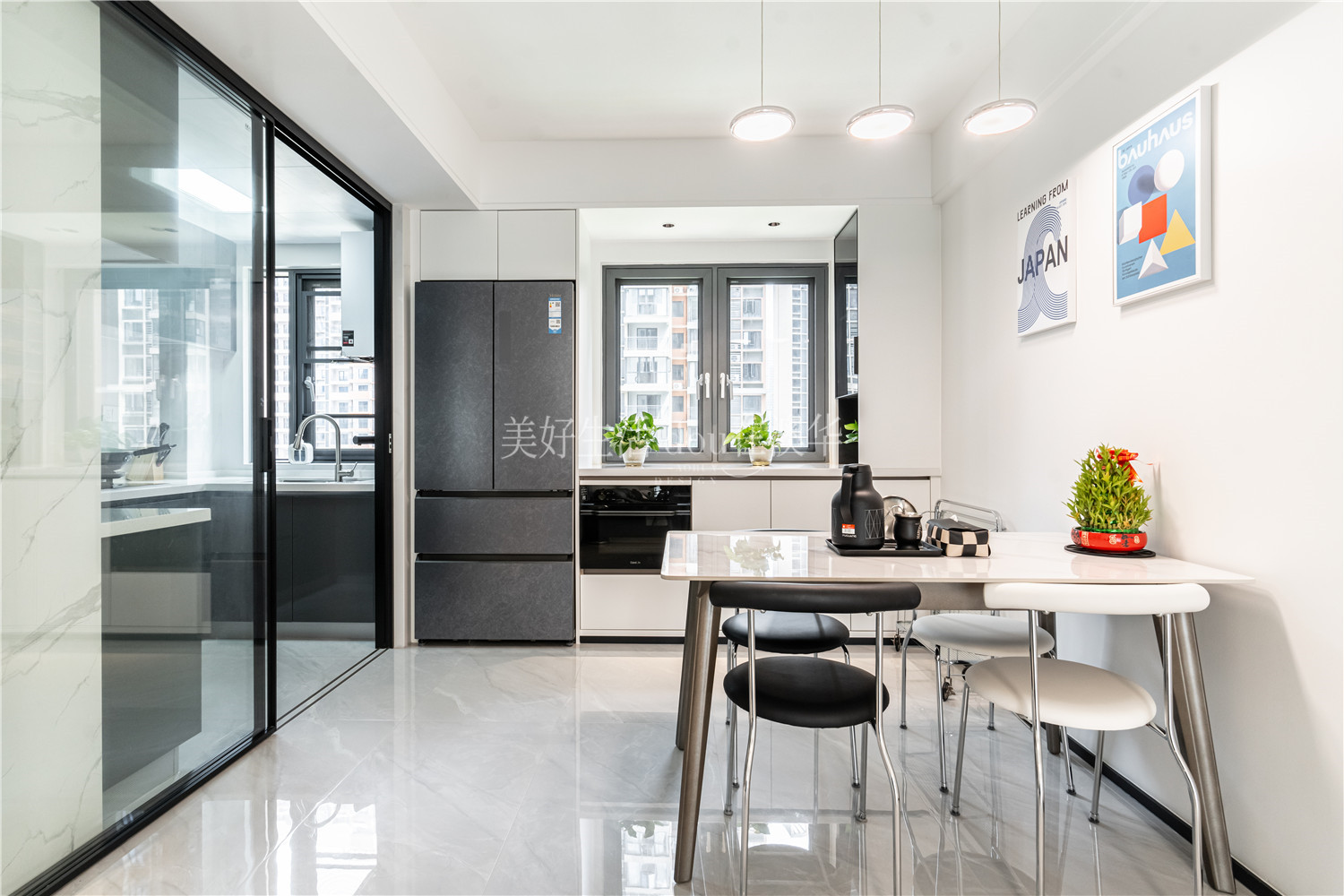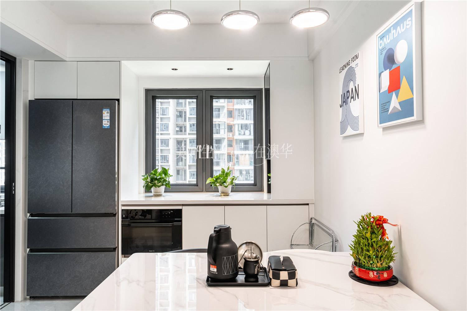 • 窗前定制的餐边柜,将冰箱、蒸烤箱等电器完全嵌入,不仅贴合居者的日常习惯,还补充了厨房的收纳与功能需求,让餐厨生活更加井然有序。
